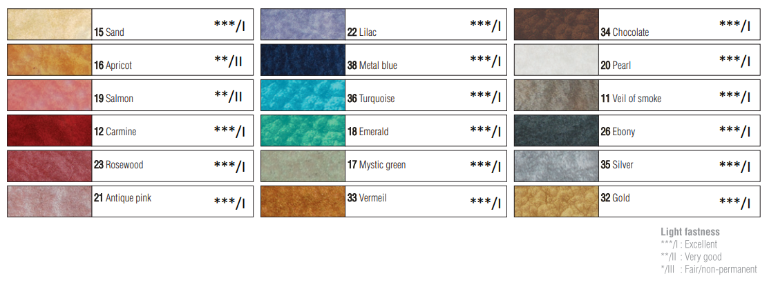 Farby sú svetlostále a hneď pripravené na použitie. Na dotyk sú suché po 2 hodinách, úplne vyschnú po 10 hodinách. Po zaschnutí sú odolné voči šetrnému umývaniu, ale nie sú vhodné do umývačky riadov.