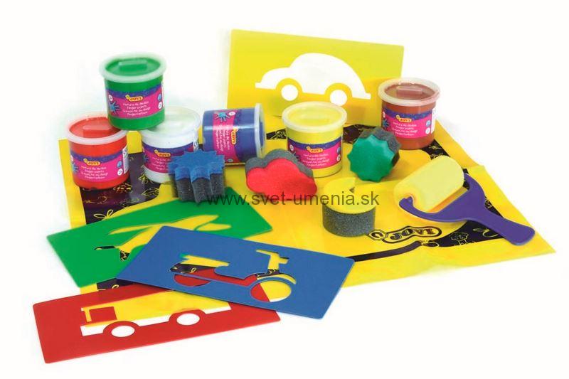 Sada obsahuje: 6 kelímkov farieb, 4 špongie rôznych tvarov, 4 šablóny na maľovanie, 1 penový valček, 1 ochrannú podložku.