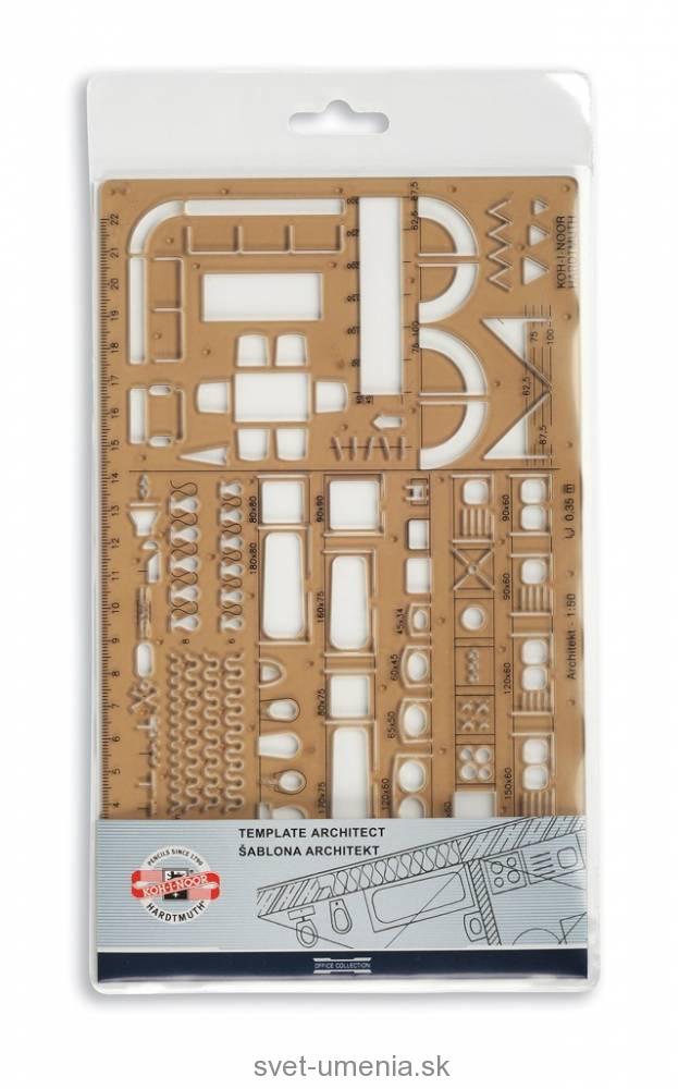 Šablona architekt je vyrobená z priehľadného copolystyrénu. je určená na kreslenie schém architektonických návrhov v pomere 1:50, pomocou ostrej ceruzky, mikroceruzky, versatilky alebo technickým perom 0,35mm. Na hornej hrane šablóny je milimetrová stupnica dĺžky s označením každého celého centimetra.