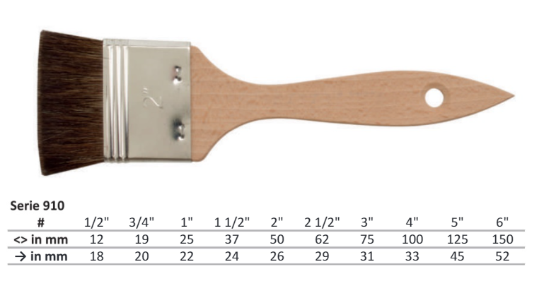 Ploché štetce série 910 sú vyrobené z prírodných chĺpkov poníka tmavej hnedej farby, kovanie je z nerezového plechu, majú krátku nelakovanú rukoväť. Vhodné sú na maľbu akvarelovými farbami. Štetiny majú vysokú absorbčnú schopnosť.