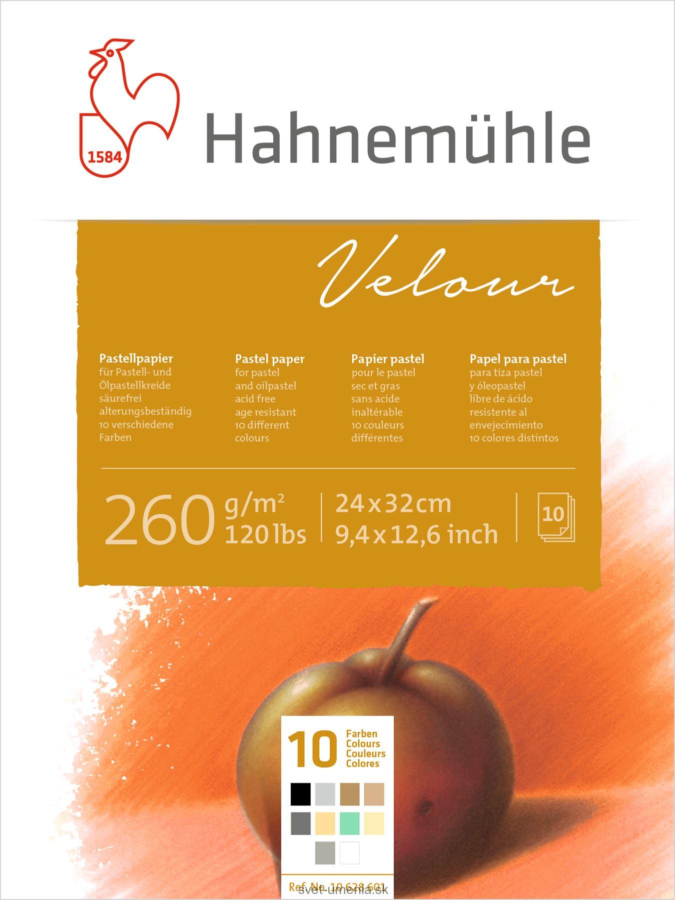 Papier Hahnemuhle Velour je umelecký papier určený na kresbu pastelom. Neobsahuje žiadne kyseliny. Papier sa skladá z podkladovej vrstvy, na ktorej je vrstva s inertnými syntetickými vláknami, ktoré vytvárajú zamatový povrch. Tento povrch veľmi dobre drží pigmenty suchého a olejového pastelu, a tiež uhlíkov a mäkkých grafitových ceruziek.