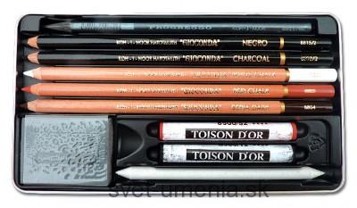 Sada obsahuje: ceruzka v laku progresso 6B - 8911, biela krieda v ceruzke - 8801, rudka červená v ceruzke - 8802, rudka hnedá tmavá v ceruzke - 8804, umelý uhlík v ceruzke tvrdosť 2- 8810, umelecké čierna tuha v ceruzke SILKY BLACK 8815, suchý pastel č.12 siena - 8500, suchý pastel č.52 čierna kostná - 8500, papierové rozotieratko, plastická guma.