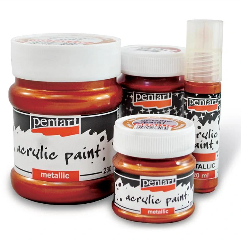 Metalické akrylové farby od Pentartu sa vyznačujú výbornou krycou schopnosťou, veľmi rýchlo usýchajú a po zaschnutí sú vodeodolné. Ideálne sú pre maľovanie na rôzne druhy povrchov. Vyrobené sú na báze vody, s vodou sa aj ľahko miešajú. Umelcovi ponúkajú široké spektrum žiarivých a veľmi intenzívnych farieb. Obsahujú veľké množstvo metalických kovových pigmentov, ktoré na povrchu vytvárajú krásne lesklé efekty. Sú to univerzálne umelecké farby s tou najvyššou kvalitou. Hodia sa nielen na umelecké maľovanie, ale aj na dekorovanie predmetov. Sú veľmi obľúbené u profesionálnych maliarov, umelcov laikov, či u hobby kreatívcov.