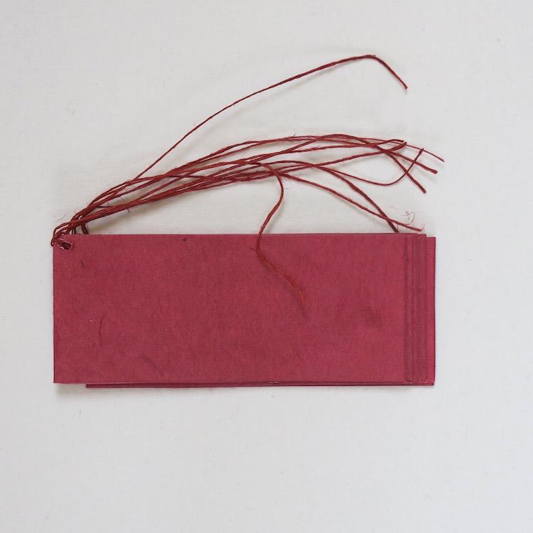 Ručne vyrábaný štítok z lokta papiera od Khadi papers. Dostupné sú v 10 farbách. Štítky sú vhodné napr. ako menovka na darček. Štítky majú dierku a šnúrku.