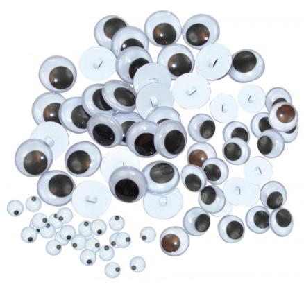 Oči s pohyblivou zorničkou v rôznych veľkostiach s očkom na prišitie. Priemer očiek 10-15mm. Menšie očká majú samolepiaci podklad.