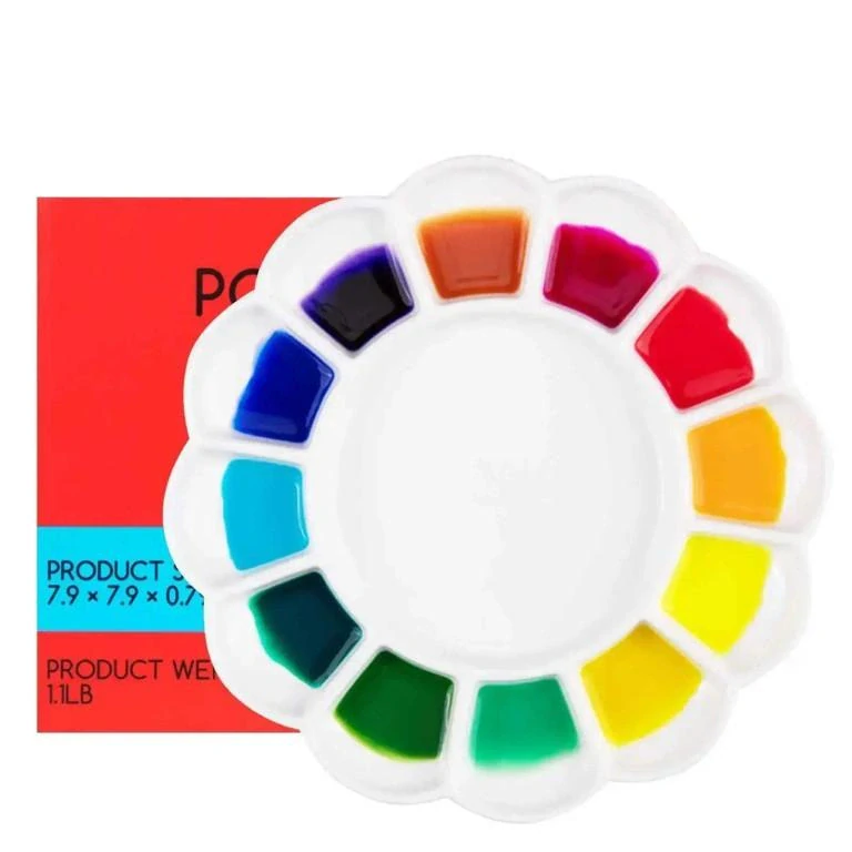 Keramická paleta vyrobená z prvotriedneho ekologického materiálu. Praktické usporiadanie 12 priehradiek na farbu naumožňuje jednoduchý výber a miešanie doplnkových a komplementárnych farieb. Veľká hladká plocha uprostred na miešanie farieb bez vytvárania hrudiek. Paleta má široké možnosti použitia, je vhodná na akvarel, kvaš, akryl, olejové a temperové farby. Ideálne na štúdium maľby, remeselné projekty atď.