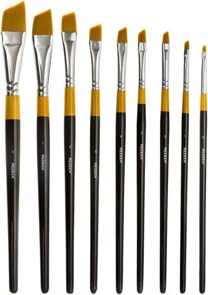 Sada 9 plochých zošikmených štetcov. Vhodné sú na maľovanie olejovými, akrylovými, akvarelovými, temperovými farbami. Určené sú pre profesionálnych umelcov, ale aj študentov, začiatočníkov a amatérov. Nylónové štetiny sú veľmi odolné a držia tvar štetca. Štetce po použití umyte v teplej vode a upravte ich tvar, tým zaistíte ich dlhú životnosť. Dĺžka rukoväte je cca 200-225mm.