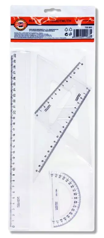 Sada rysovacích potrieb vhodná na rysovanie priamok, rovnobežiek, kolmíc, uhlov a pod. Rysovacie pomôcky sú vyrobené z číreho priehľadného polystyrénu. Presnosť stupníc je 0,2% dĺžky.