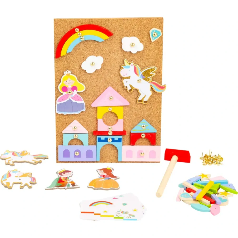 Vďaka drevenému kladívku a malým klinčekom bude vaše dieťa na korkovej podložke vytvárať obrázky s jednorožcom a princeznou. Koláže môže tvoriť podľa 4 předlohových kartičiek, alebo podľa vlastnej fantázie.