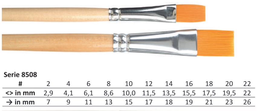 Ploché štetce série 8508 sa vyrábajú zo syntetických chĺpkov zlatej farby, majú krátku lakovanú rukoväť prírodnej farby a poniklované kovanie. Určené sú pre školy a hobby umelcov.