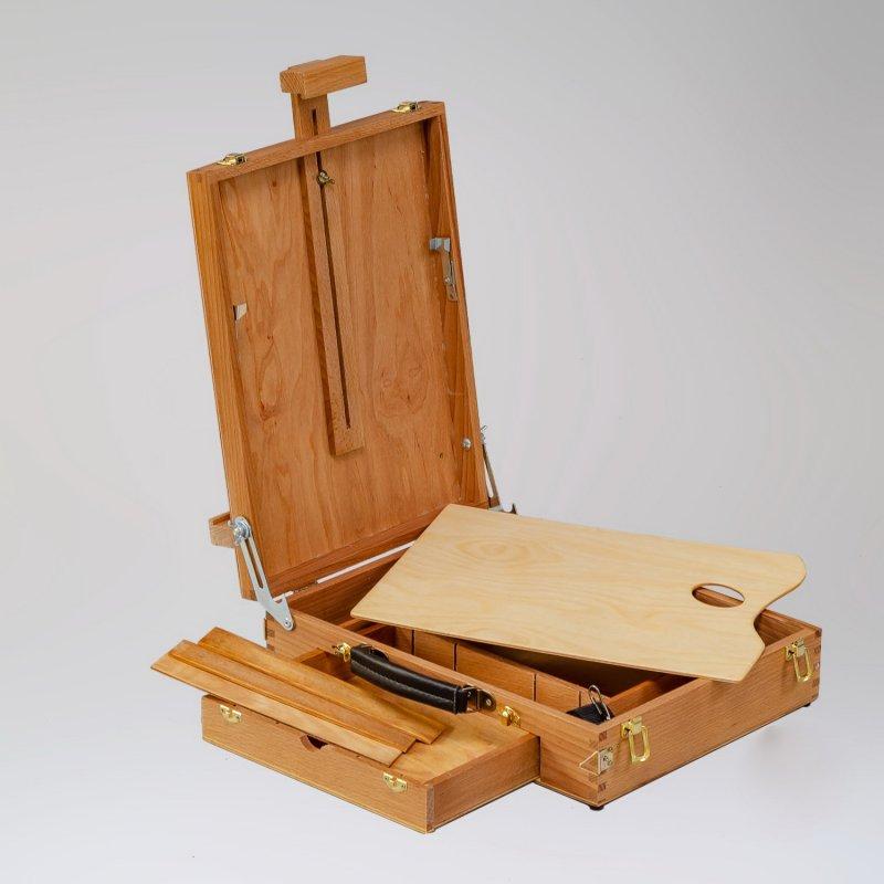 Praktický stolový kufríkový maliarský stojan s pohodlnou rukoväťou na jednoduché prenášanie. Súčasťou kufríka je drevená paleta a výsuvný šuflík na uskladnenie maliarských potrieb. Stojan je vyrobený z kvalitného bukového dreva a podpustený ľanovým olejom. Pre lepšiu stabilitu má stojan pogumované nožičky. Váha stojana je 3,5kg, maximálna výška plátna 61cm, nosnosť do 7kg, rozmery stojana v zloženom stave: 41,5x31x10cm.
